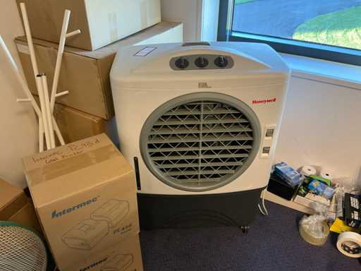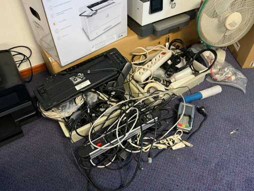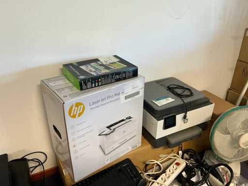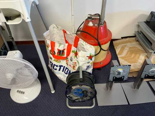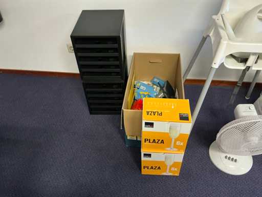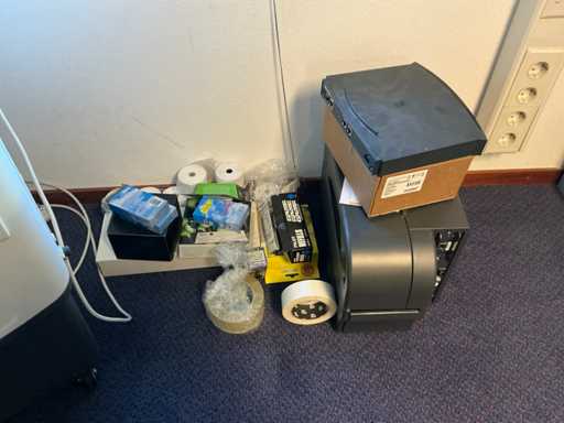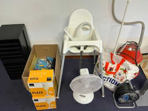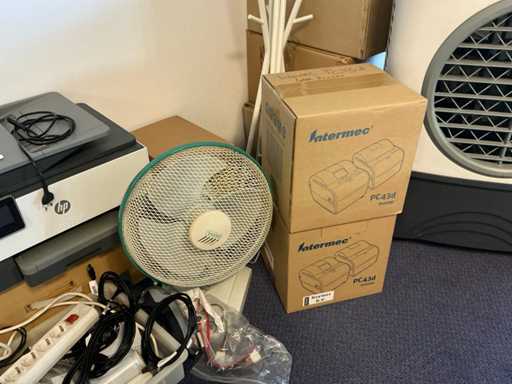 Diversen w.o. HP Laserjet printer, 2x Intermec labelprinter, Honeywell mobiele fan, kinderstoel, kantoorgerei etc