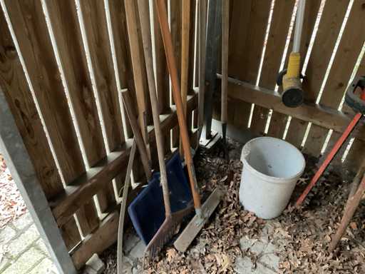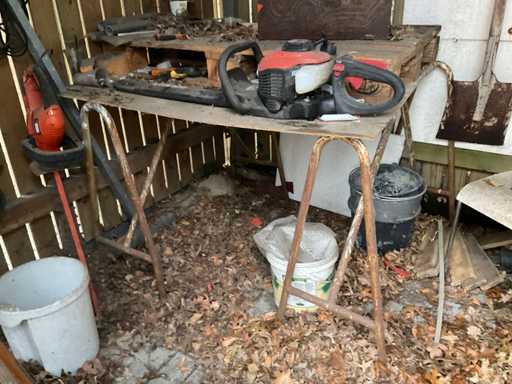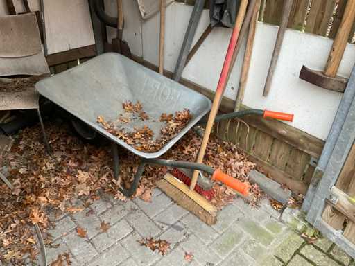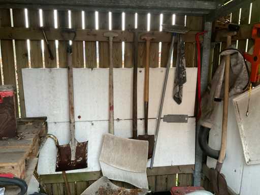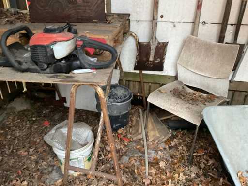 Betreft de inhoud van een schuur, bestaande uit oa: brandstof aangedreven heggenschaar, elektrische heggenschaar, kruiwagen, onkruidfrees, 2 schragen met blad, diverse vegers, bezems, scheppen, harken, emmers en stoel.