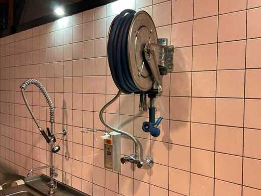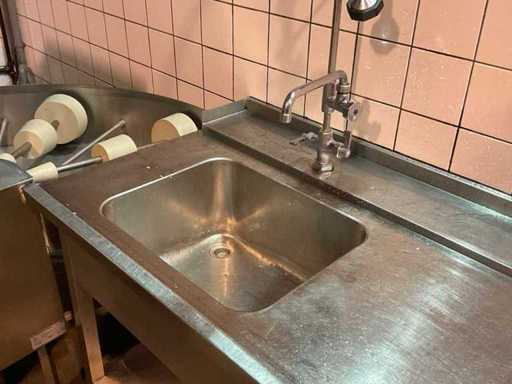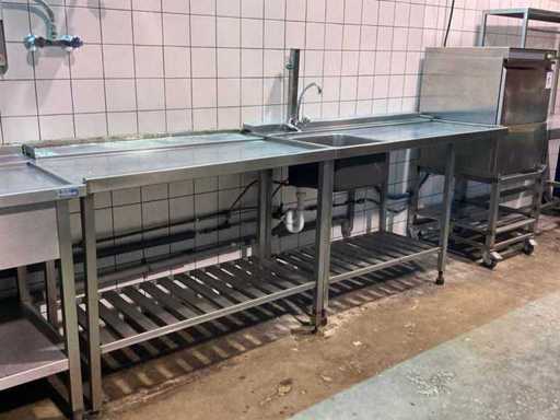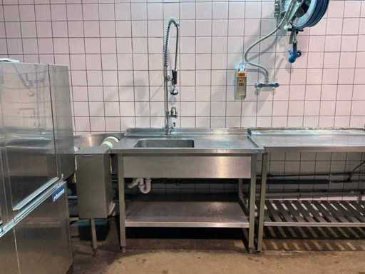 spoelbak afm. ca. 50x40 cm; v.v. handdouche en mengkraan; incl. (1x) doorschuiftafel; afm. ca. 115x74 cm; (1x) spoeltafel met mengkraan; afm. ca. 145x74 cm; met (1x) RVS slanghaspel