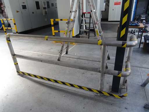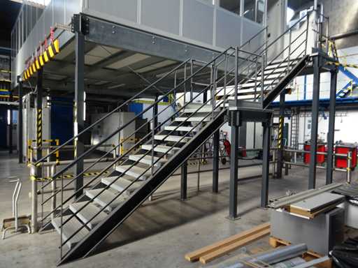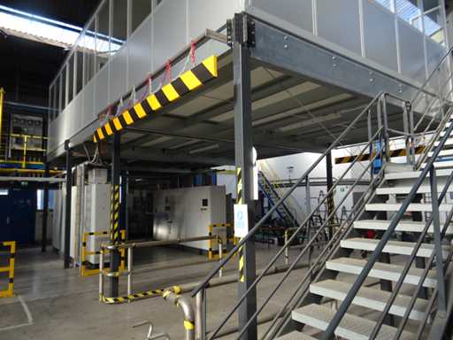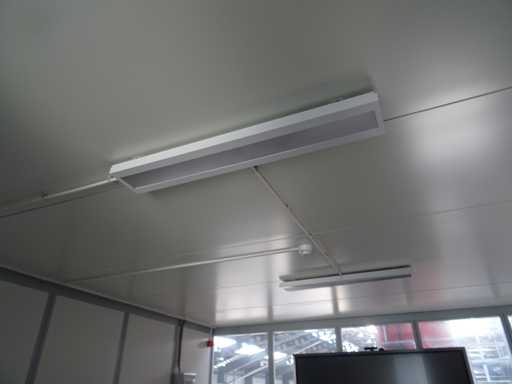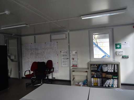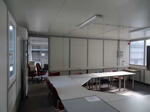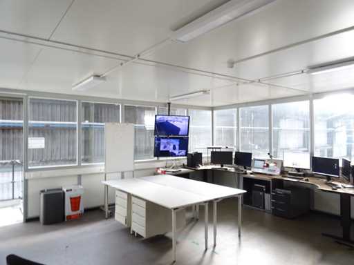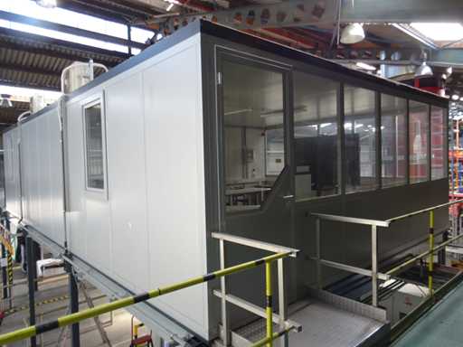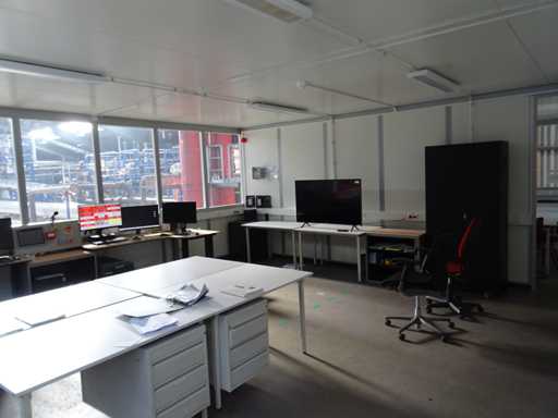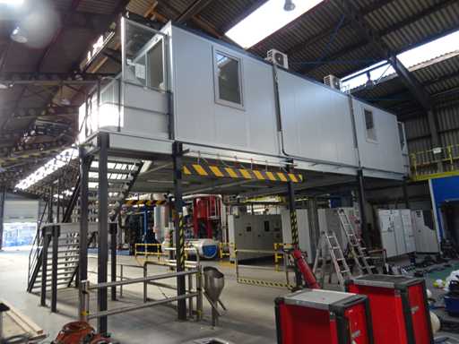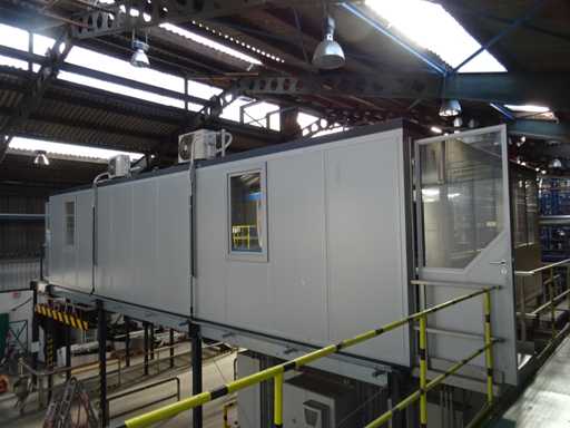 afmeting dubbele kantoorunit circa 270x640x1140cm waarvan 2 ruimtes circa 620x640cm en 520x640cm, voorzien van verlichting, elektra en beide ruimtes voorzien van Toshiba airconditioning. (zonder meubilair). 1 zijde voorzien van trapdeel. Afmeting entresolvloer circa 350x640x1140cm, doorrijhoogte : 305cm. Totale hoogte inclusief kantoorunit circa 620cm. Met stootranden. Elektra dient professioneel te worden ontkoppelt.