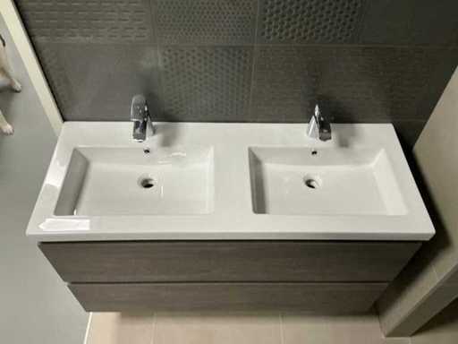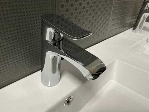Voorzien van 2 Hansgröhe Metris wastafelmengkranen. Wastafel van keramiek.