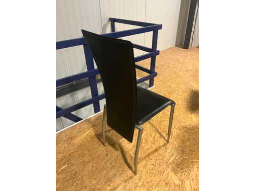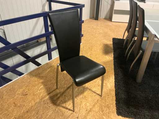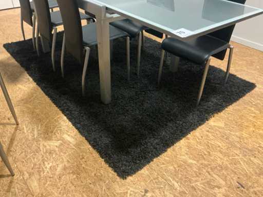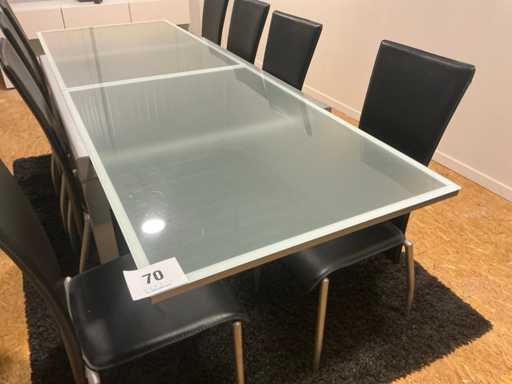 Voorzien van glazen bovenblad, compleet met 8 diverse eetkamerstoelen voorzien van skailederen bekleding en tapijt