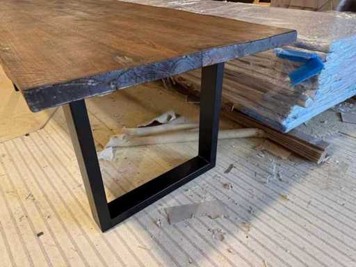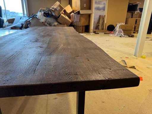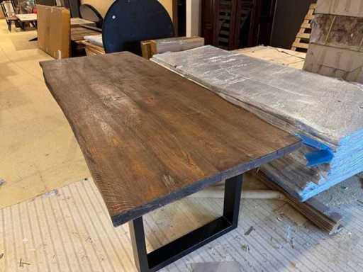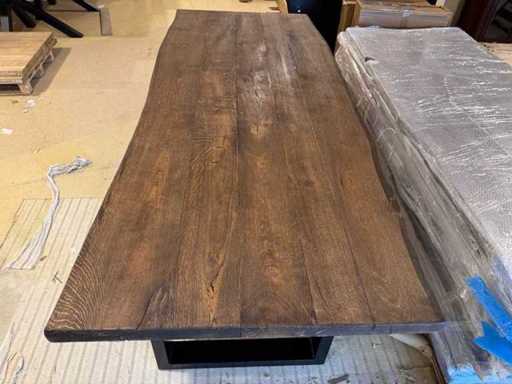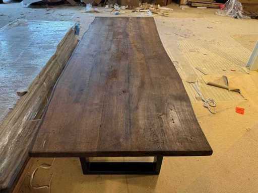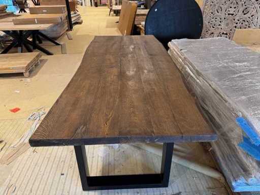 Eettafel - massief eiken - donkerbruin - zwart metalen U-poot - boomstamtafel