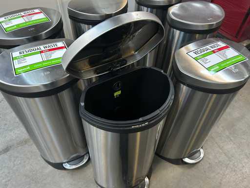 Lot bestaande uit 8 inox afvalemmers met pedaal, geschikt voor gebruik in kantoor-, bedrijfs- of gemeenschappelijke ruimtes. De afvalemmers zijn uitgevoerd in roestvrij staal, voorzien van pedaalbediening en uitneembare binnenemmer. inhoud 30l
