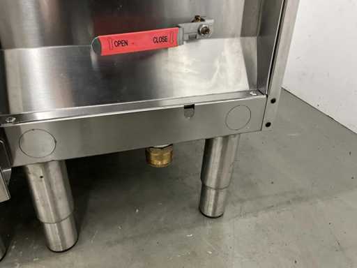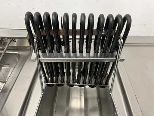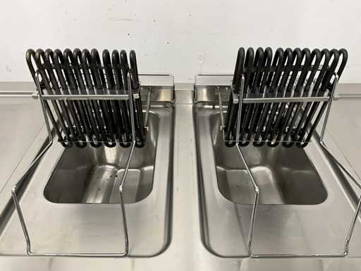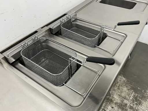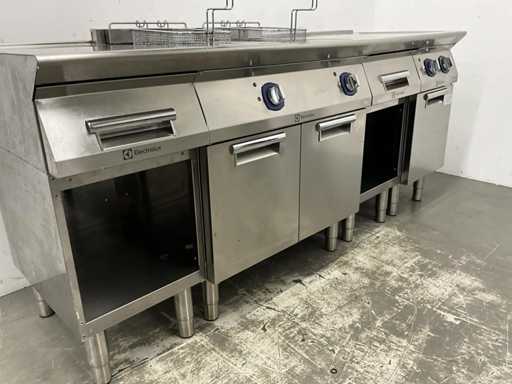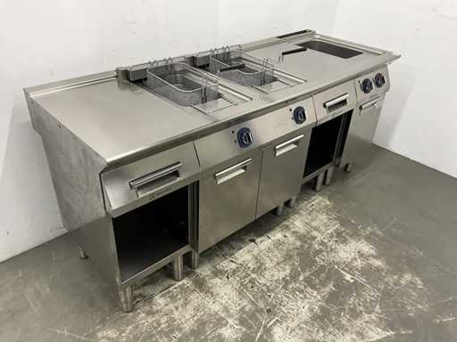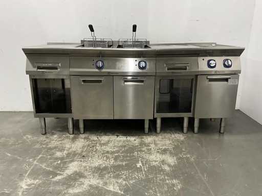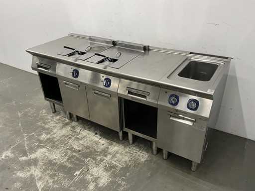 V.v. (v.l.n.r.) neutrale unit, dubbele friteuse (E7FREH2FF0 - 400V - 17,4 kW - 2x 14 Liter), neutrale unit en pastakoker (E7PCED1KF0 - 400V - 6 kW).