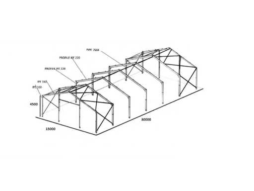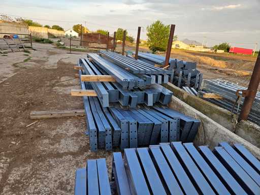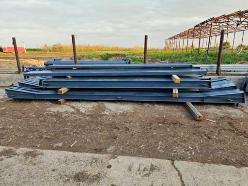 Aanvullende informatie Staalconstructie; Richelhoogte 6500 mm; Bouwjaar 2026; Aanvullende informatie Dakhelling: 20 graden; Geschilderd RAI 5023; De constructie bestaat uit 2 balken (vakwerkten) aan de uiteinden die zijn gemaakt van een IPE 160-profiel, 5 tussenliggende balken (vakwerk) van het IPE 220-profiel, 4 kolommen aan de uiteinden van het IPE 160-profiel, 10 tussenliggende kolommen van het IPE 220-profiel. 4 deurkolommen van vierkante pijp 100x100x4, 6 druksteunen van leiding 76x4, windstrip voor balken en kolommen van gegalvaniseerd staal met 16mm spanner, de hele constructie is op schroeven (demonteerbaar) Staat: ongebruikt; De hele constructie bevat een certificaat van conformiteit voor materialen, een bouwschets en een funderingsplan. Vrijeladen.