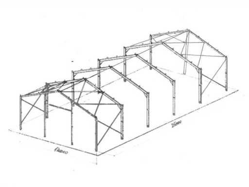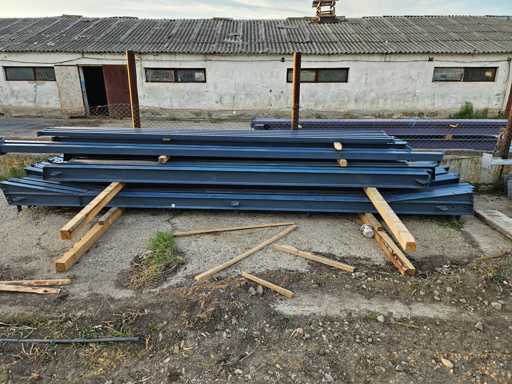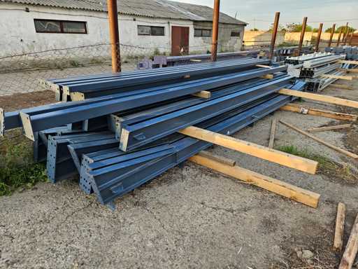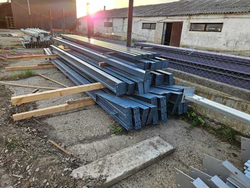 Aanvullende informatie Dakhelling: 20 graden; Geschilderd RAI 5023; De constructie bestaat uit: 2 balken (vakwerk) aan de uiteinden die afkomstig zijn van het IPE 160-profiel; 4 tussenliggende balken (spanten) uit het IPE 200-profiel, 4 eindpalen uit het IPE 160-profiel, 8 tussenliggende palen uit het IPE 200-profiel; 3 deurpalen uit de vierkante pijp 100x100x4; 5 drukstaanders van de 76x4 pijp; windstrip voor balken en palen gemaakt van gegalvaniseerd staal met 16mm spanner; de hele constructie is op schroeven (afbreekbaar); Conditie: ongebruikt; De gehele structuur bevat een certificaat van conformiteit voor materialen, bouwtekening en funderingsplan. Vrijeladen.