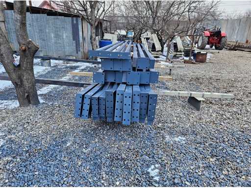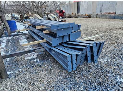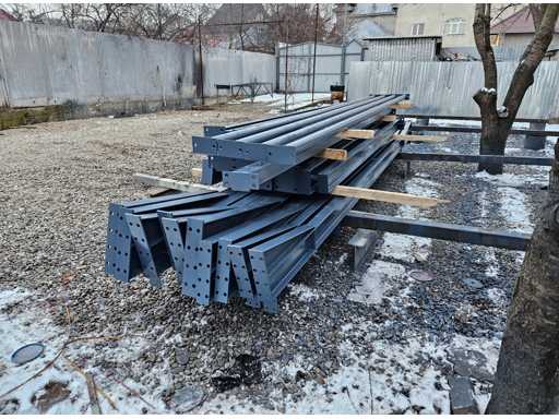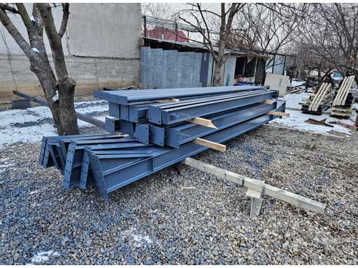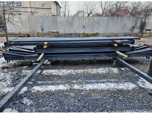 Aanvullende informatie Dakhelling: 20 graden; Geschilderd RAI 5023; De constructie bestaat uit: 2 balken (vakwerk) aan de uiteinden die afkomstig zijn van het IPE 160-profiel; 3 tussenliggende balken (vakwerk) uit het IPE 200-profiel, 4 eindpalen uit het IPE 160-profiel, 6 tussenliggende palen uit het IPE 200-profiel; 3 deurpalen uit vierkante pijp 100x100x4; 4 drukpalen van de 76x4 buis; windstrip voor balken en palen gemaakt van gegalvaniseerd staal met 16mm spanner; de hele constructie is op schroeven (afbreekbaar); Conditie: ongebruikt; De gehele structuur bevat een certificaat van conformiteit voor materialen, bouwtekening en funderingsplan. Vrijeladen.