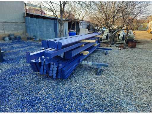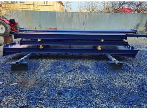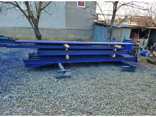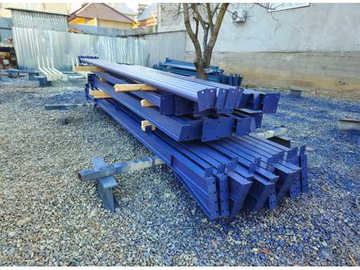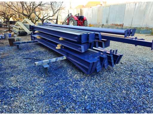 Aanvullende informatie Dakhelling: 20 graden; Geschilderd RAI 5017, bestaat de constructie uit: 2 balken (vakwerk) aan de uiteinden die afkomstig zijn van het IPE 160-profiel; 4 tussenliggende balken (spanten) uit het IPE 180-profiel, 4 eindpalen uit het IPE 160-profiel, 8 tussenliggende palen uit het IPE 180-profiel; 3 deurpalen uit de vierkante buis 100x100x4; 5 drukspalen van de 70x4 pijp; windstrip voor balken en palen gemaakt van gegalvaniseerd staal met 16mm spanner; de hele constructie is op schroeven (afbreekbaar); Conditie: ongebruikt; De gehele structuur bevat een certificaat van conformiteit voor materialen, bouwtekening, funderingsplan... Vrijeladen.