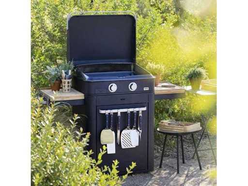 Bakplaat • Dubbelwandig gietijzer 7 mm • Meerlagig email • Hoge anti-spatrand • Afvoergoot • Kookvlak 56 x 40 cm Gasbranders • 2 ronde gasbranders - 4,8 kW • Knoppen met geïntegreerde elektronische ontsteking • Elektronische ontsteking met één hand • Thermokoppelveiligheid • Propaan-, butaan- of aardgas (Kit voor aardgasaansluiting optioneel) Karkas • Gegalvaniseerd staal, gepoedercoat Blue Navy • 4 regelbare poten • 1 opvangbak inox 0,7 L met niveau-indicator Roltafel • Structuur: galva staal gepoedercoat Blue Navy • Uitrusting: 2 deuren met alu handvat, zwart 4 wielen waarvan 2 all-terrain en 2 rolwieltjes met rem 2 uittrekbare werktafels met handvat