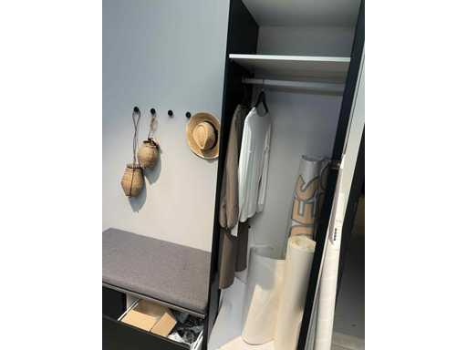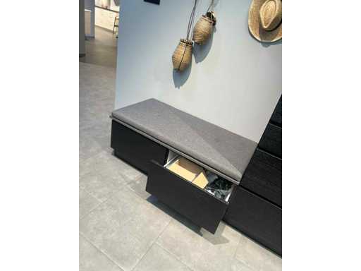 1800mm kast met twee lades van 60 cm bij 58 cm diep, die dient als bank met een extra kussen. + Kolom 60 garderobe. 2200 mm hoog voor de kolom. Nog steeds te zien in de winkel van Kvik Gosselies.