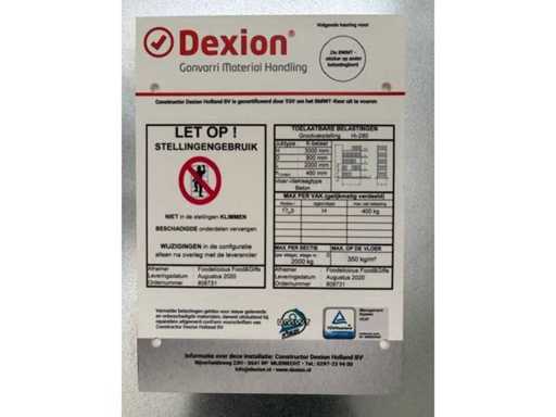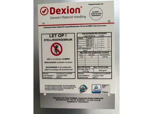 Hoogte 300 cm, voor voor vloeroppervlakte zie plattegrond. 42 sectie metalen legbord stelling (100 x50 cm), 14 secties houten legbordstelling (220 x75 cm) Demontage op afspraak, er is geen heftruck aanwezig