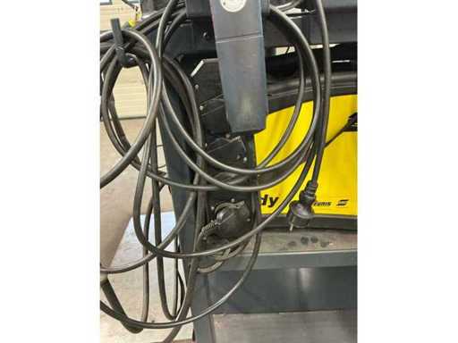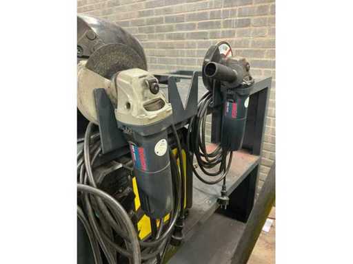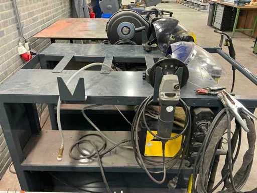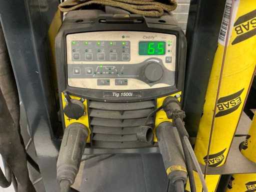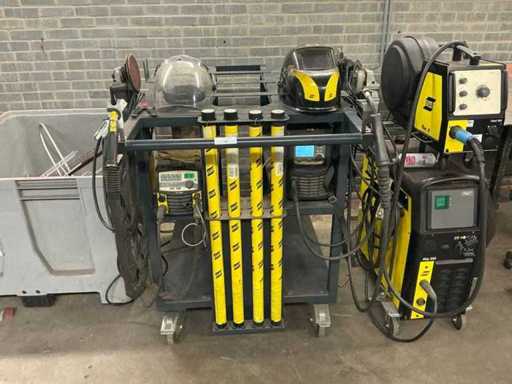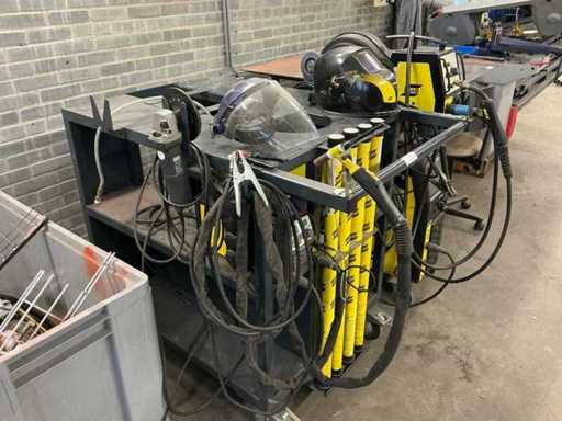 Bestaande uit: stalen kar met twee zwenkwielen en stroomaansluiting, Esab Caddy Tig 1500i tig lasapparaat, Esab Caddy M32 Mig lasapparaat, 4 kokers met Esab OK Tigrod laselektrodes 1,6 en 2 mm, Esab lasklem en 3 Bosch haakse slijpers