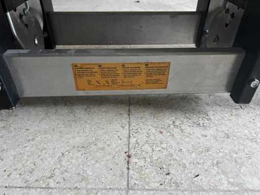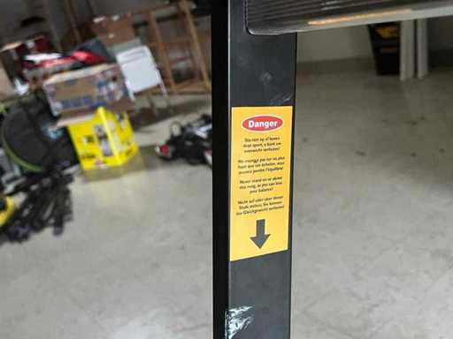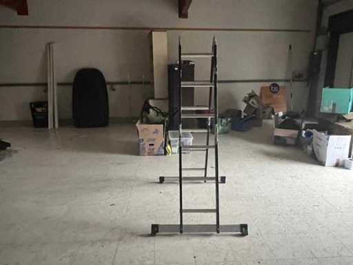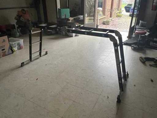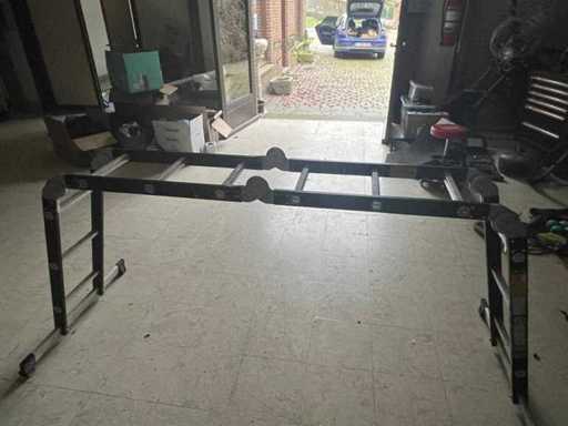 Multifunctionele professionele plooiladder, 4-in-1 inzetbaar (A-stand, rechte ladder, werkplatform, trapstand). Voorzien van scharnierende verbindingspunten en antislipvoeten. Professionele uitvoering met scharniervergrendelingen. In gebruikte staat (zie foto's).