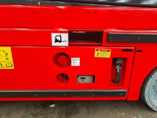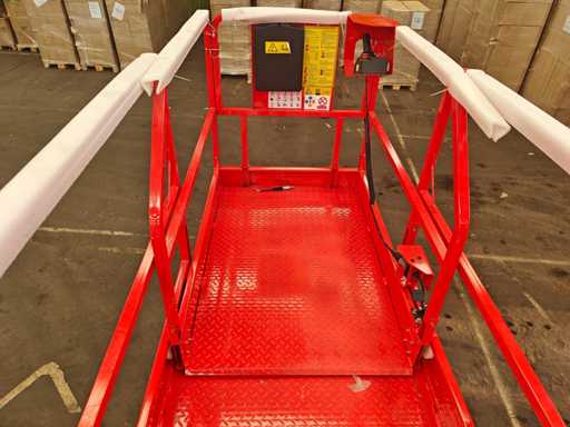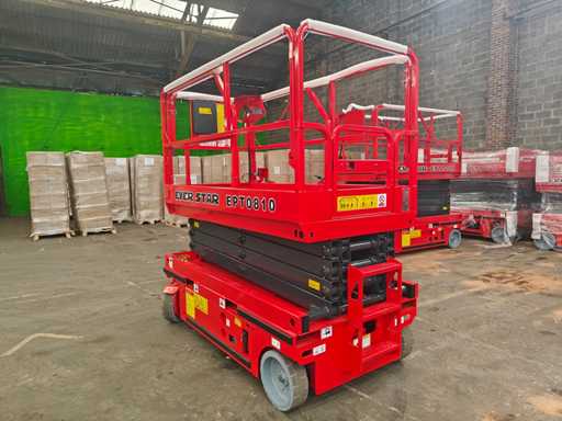 Ever Star EPT0810 scissor lift – ongebruikt – elektrisch aangedreven, zelfrijdende uitvoering – maximaal werkhoogte ca. 10 m, platformhoogte ca. 8 m – werkplatform afmetingen 2270 × 1120 mm – platformverlenger 900 mm – draagvermogen 450 kg (op platform) / 113 kg op uitgelegde extension – maximum 2 personen – elektrische hefmotor 24 V / 4 kW – batterijconfiguratie 4×6 V, ca. 200 Ah – charger 24 V / 25 A – rijsnelheid ingeklapt ca. 2 km/u, bij verheven platform geen rijfunctie – op-/neersnelheid ~40/35 s – maximaal werkbare helling ca. 2°/3° – CE-gecertificeerd – solide breed spoor (1500 mm breedte) – stabiel en veilig platform met leuningen – ideaal voor binnen en buiten toepassingen zoals onderhoud, installatie, magazijnwerk – compact, stabiel en krachtig inzetbaar