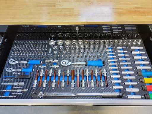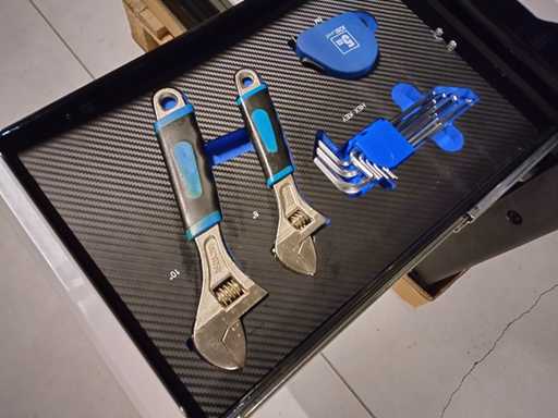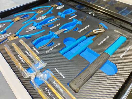 Gereedschapswagen 12 laden waarvan 10 gevuld met gereedschap, houten bovenblad