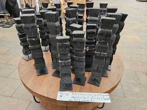 Unieke set van 40 handgemaakte Afrikaanse cultfiguren (20 sets van 2 stukken). Elke figuur is uit massief hout gesneden en fascineert met zijn individuele, mystieke karakter. De diepzwarte kleur en de opvallende geometrische gravures maken deze objecten tot een indrukwekkende blikvanger in elke moderne woonomgeving of als exclusieve galeriedecoratie. De figuren staan stabiel op vierkante metalen voeten en kunnen uitstekend als groep of afzonderlijk worden geplaatst.