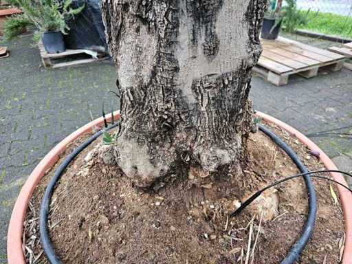 Deze indrukwekkende olijfboom (Olea europaea) is een waar meesterwerk van de natuur en een hoogtepunt voor elke veeleisende tuin. Met een trotse leeftijd van ongeveer 110 jaar en een artistieke bonsaislijp, belichaamt dit exemplaar pure mediterrane elegantie. De massieve, sterk gegroefde stam met een omtrek van ongeveer 160 cm getuigt van meer dan een eeuw geschiedenis. De dichte, zilvergroene kroon is perfect gevormd en maakt deze boom een exclusieve solitaire plant.