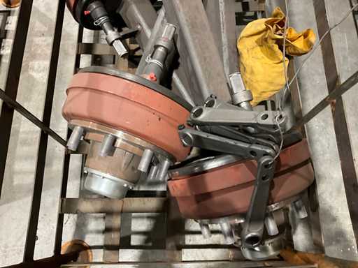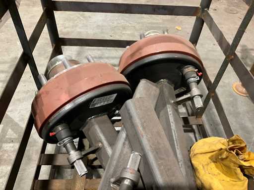 totale lengte asstomp 850 mm, voorzien van 6x remhevel, remtrommel breedte circa 110 mm, 8 bouts/steek circa 270 mm, in en met juk