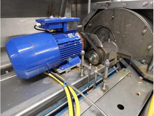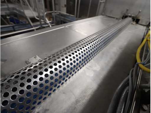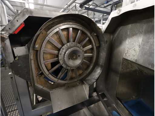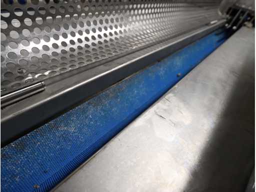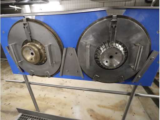 Mes diameter circa 400 mm, voorzien van aanvoer transportband, lengte circa 3000 mm, in rvs frame afmeting 3100x650x900 mm, 1,5 kW, inclusief 2 reserve messen, zonder bordes en roostervloer