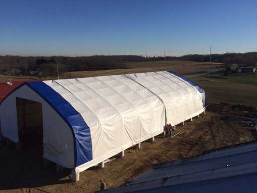 Opslagshelter, voorzien van dubbel trussen-/buizensysteem; gegalvaniseerd; ruimte tussen bogen: 3050 mm; afmeting gording: Φ 76x2,0 mm; oprolbare deur met lier, afmeting: 5,49x4,89 meter; materiaal 610 gram PVC; kleur wit; inclusief montage handleiding; ongebruikt in 10 metalen kisten