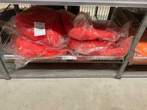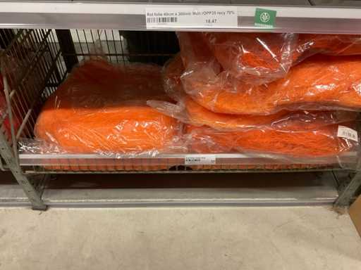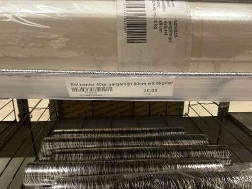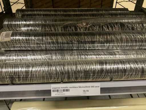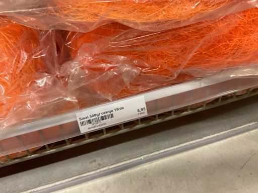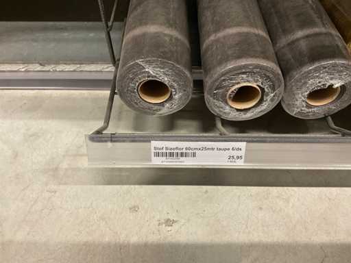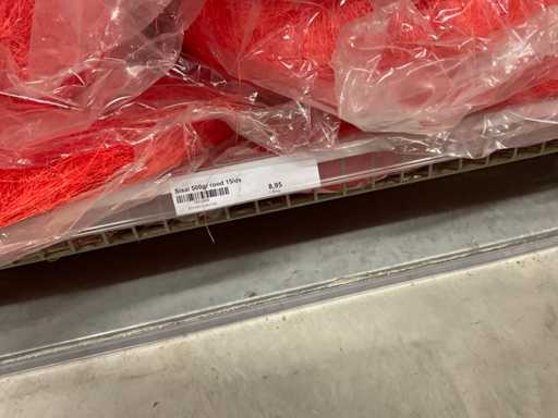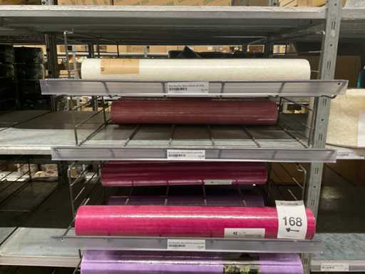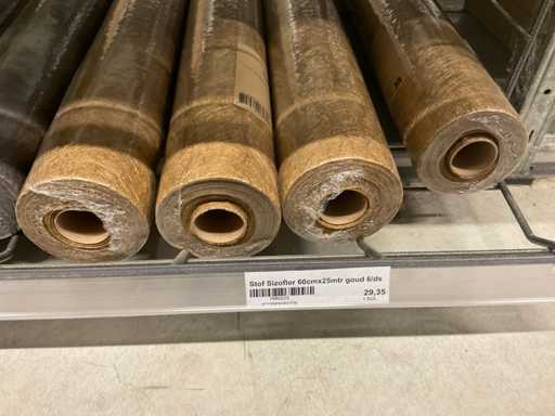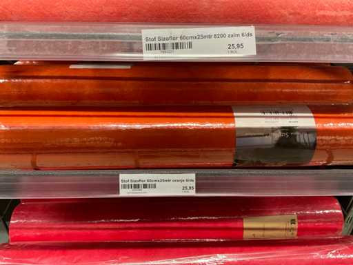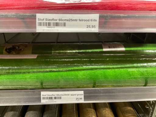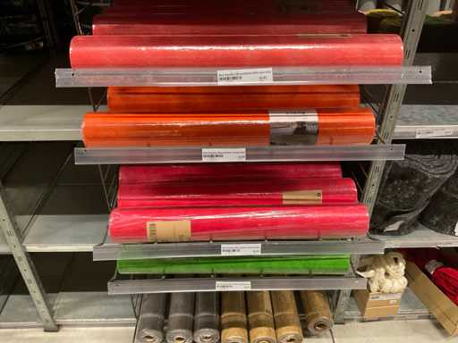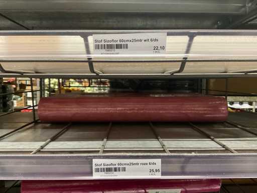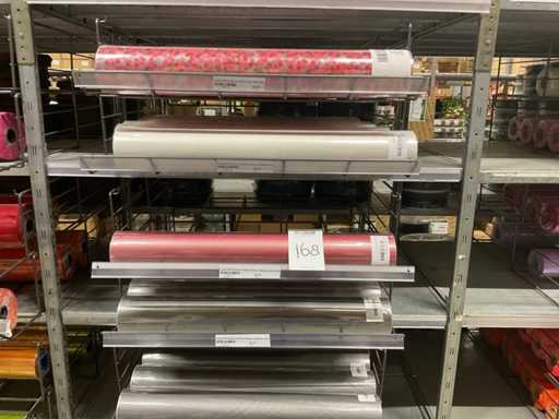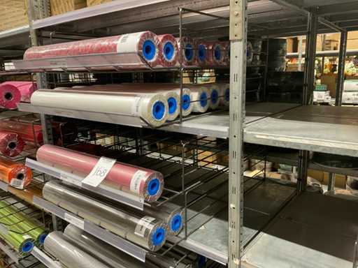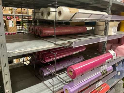 Stof op rol, type Sizoflor in diverse kleuren, maat meeste 60cmx25 meter, OPP folie v.v. diverse prints op rol, breedte 60 cm in diverse lengtes en sisal, in 5 stellingsecties, inclusief rolhouders en manden, stelling niet inbegrepen.