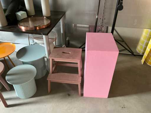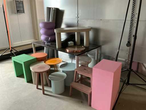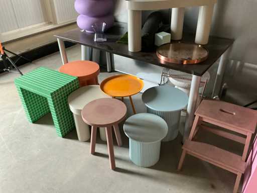 Bestaande uit: bijzettafel, kruk, decoratie/displayblokken, 2 tafels.
