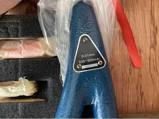 Elke micrometer is voorzien van twee gemakkelijk verwisselbare aambeelden. Dit model heeft een meetbereik van 500-600 mm. Schaalverdeling: 0,01 mm Staat van