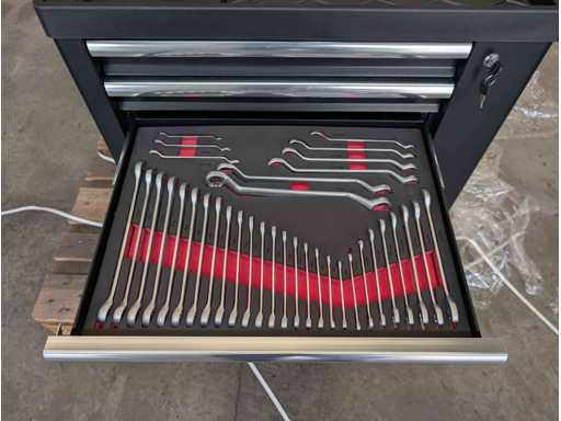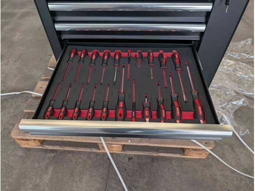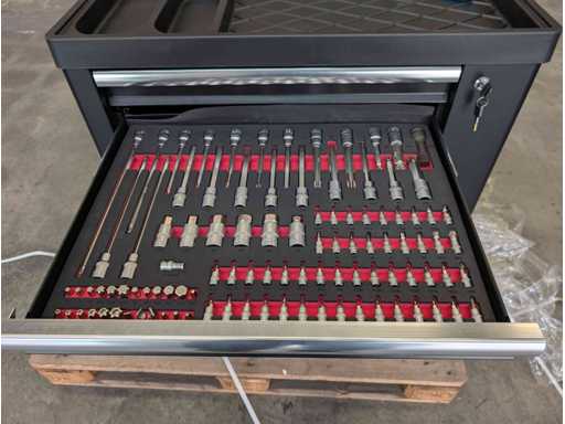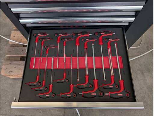 Professionele gereedschapswagen met een 280-delige gereedschapsset. Maximale wagenbelasting 475 kg, maximale ladebelasting 35 kg. 7 lades met gecentraliseerd slot.
