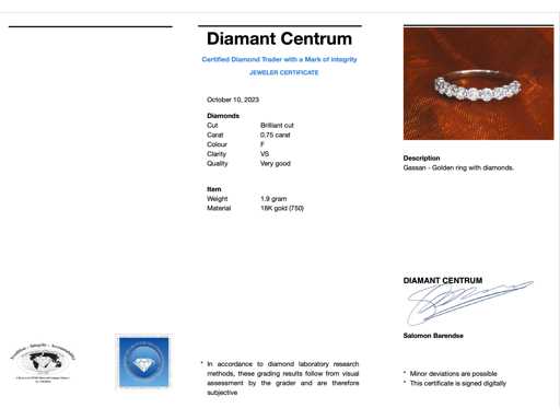 Diamant: Natuurlijk; Aantal: 9 stuks; Slijpvorm: Briljant geslepen; Gewicht (carat): 0.75 carat; Kleur: F; Zuiverheid: VS; Slijpkwaliteit: Zeer mooi; Juweel: Ring; Merk: Gassan diamonds; Gewicht: 1.9 gram; Ringmaat (op maat gemaakt*): 49.25 (15.75 mm); Materiaal: 18k goud (750); Conditie: Zo goed als nieuw; Verpakking: Luxe sieradendoos; Toelichting: De kwaliteit is overgenomen van het rapport behorend bij item. De waardebepaling is een beoordeling van een gecertificeerde diamantair, gebaseerd op consumentenprijzen.; Consumentenprijs: € 6.600,-