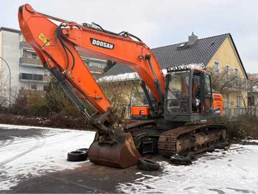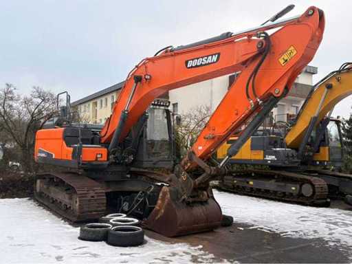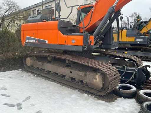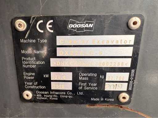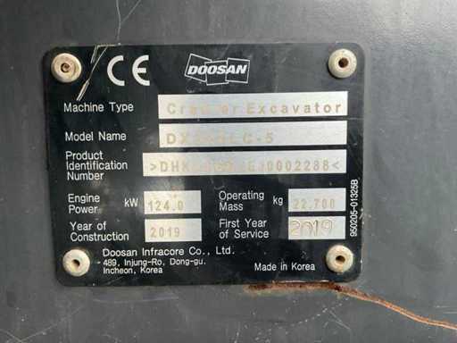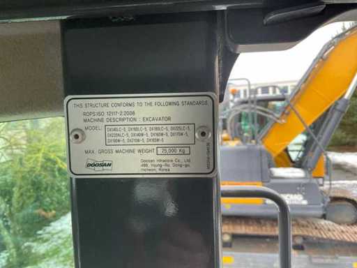 Laadhoogte: 6.840 mm, Brandstof: Diesel, Brandstofcapaciteit: 400 l. Productieland: Zuid-Korea, Kenmerken: De graafmachine is ontworpen voor hoge prestaties, gebruiksgemak en brandstofverbruik. Hij beschikt vaak over functies zoals achter- en zijcamera's, automatische smering en FOPS-gecertificeerde cabinebescherming.