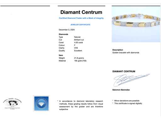 Diamant: Natuurlijk; Aantal: ca. 132 stuks; Slijpvorm: Briljant geslepen; Gewicht (carat): 4.00 carat; Kleur: F; Zuiverheid: VVS; Slijpkwaliteit: Excellent; Juweel: Armband; Gewicht: 21.8 gram; Afmetingen/lengte: 19.5 cm; Materiaal: 18K goud (750); Conditie: Nieuw; Verpakking: Luxe sieradendoos; Toelichting: De kwaliteit is overgenomen van het rapport behorend bij item. De waardebepaling is een beoordeling van een gecertificeerde diamantair, gebaseerd op consumentenprijzen.; Consumentenprijs: € 35.000,-