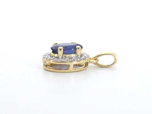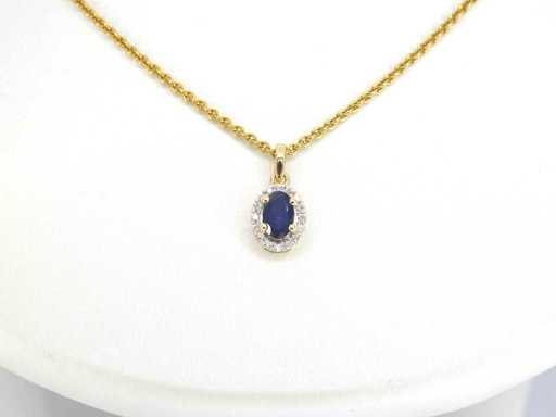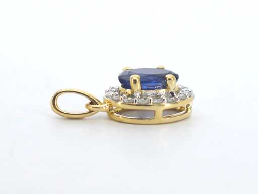 Diamant: Natuurlijk; Slijpvorm: Briljant geslepen; Gewicht (carat): 0.12 carat; Kleur: F-G; Zuiverheid: SI; Slijpkwaliteit: Zeer mooi; Edelsteen: Saffier; Aantal: 1 stuk; Slijpvorm: Ovaal; Gewicht (carat): 0.65 carat; Kleur: Blauw; Juweel: Hanger (excl. ketting); Gewicht: 1 gram; Materiaal: 14 karaat (585); Conditie: Nieuw; Verpakking: Luxe sieradendoos; Toelichting: De kwaliteit is overgenomen van het rapport behorend bij item. De waardebepaling is een beoordeling van een gecertificeerde diamantair, gebaseerd op consumentenprijzen.; Consumentenprijs: € 840,-