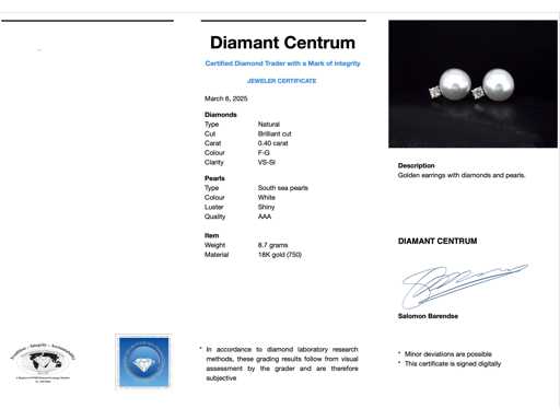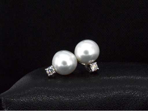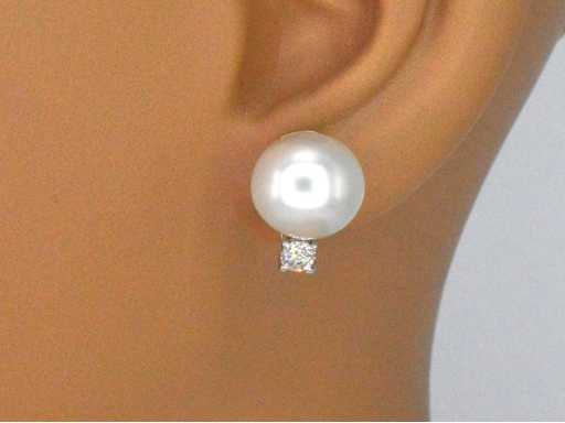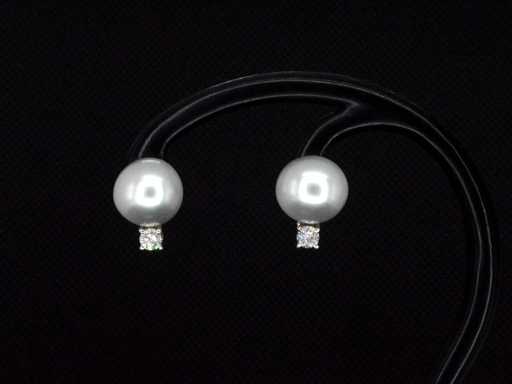 Diamant: Natuurlijk; Aantal: 2 stuks; Slijpvorm: Briljant geslepen; Gewicht (carat): 0.40 carat; Kleur: F-G; Zuiverheid: VS-SI; Parel: Zuidzee parels; Aantal stuks: 2 stuks; Kleur: Wit; Afmeting: 11.5 mm; Luster: Glanzend; Kwaliteit: AAA; Juweel: Oorbellen; Gewicht: 8.7 gram; Afmetingen/lengte: 2.4 x 2.1 cm; Materiaal: 18K goud (750); Conditie: Zo goed als nieuw; Verpakking: Luxe sieradendoos; Toelichting: De kwaliteit is overgenomen van het rapport behorend bij item. De waardebepaling is een beoordeling van een gecertificeerde diamantair, gebaseerd op consumentenprijzen.; Consumentenprijs: € 7.700,-