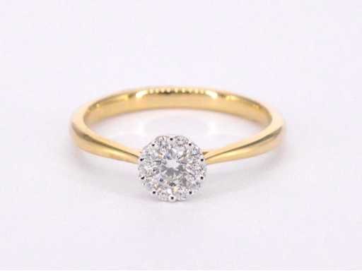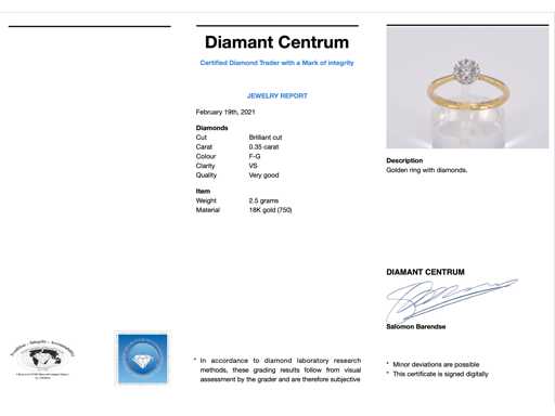 Diamant: Natuurlijk; Slijpvorm: Briljant geslepen; Gewicht (carat): 0.35 carat; Kleur: F-G; Zuiverheid: VS; Slijpkwaliteit: Zeer mooi; Juweel: Ring; Gewicht: 2.5 gram; Ringmaat (op maat gemaakt*): 53 (17 mm); Materiaal: 18K goud (750); Conditie: Nieuw; Verpakking: Luxe sieradendoos; Toelichting: De kwaliteit is overgenomen van het rapport behorend bij item. De waardebepaling is een beoordeling van een gecertificeerde diamantair, gebaseerd op consumentenprijzen.; Consumentenprijs: € 3.973,-