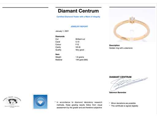 Diamant: Natuurlijk; Aantal: 1 stuk; Slijpvorm: Briljant geslepen; Gewicht (carat): 0.10 carat; Kleur: F-G; Zuiverheid: VS-SI; Slijpkwaliteit: Zeer mooi; Juweel: Ring; Gewicht: 1.6 gram; Ringmaat (op maat gemaakt*): 54 (17.25 mm); Materiaal: 14 karaat (585); Conditie: Nieuw; Verpakking: Luxe sieradendoos; Toelichting: De kwaliteit is overgenomen van het rapport behorend bij item. De waardebepaling is een beoordeling van een gecertificeerde diamantair, gebaseerd op consumentenprijzen.; Consumentenprijs: € 1.418,-