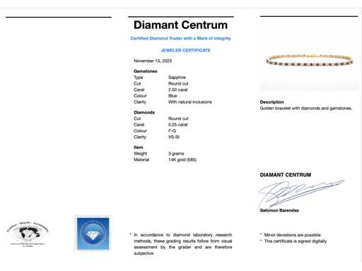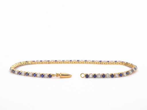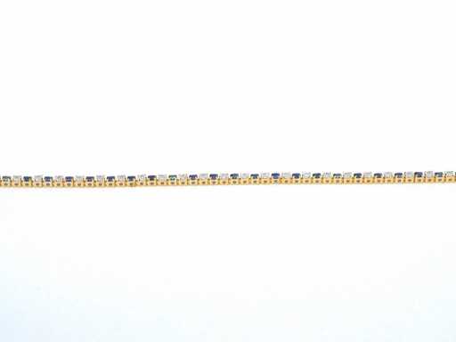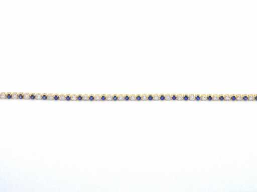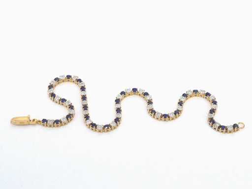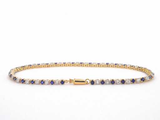 Diamant: Natuurlijk; Aantal: 34 stuks; Slijpvorm: Rond geslepen; Gewicht (carat): 0.25 carat; Kleur: F-G; Zuiverheid: VS-SI; Edelsteen: Saffier; Slijpvorm: Rond geslepen; Gewicht (carat): 2.50 carat; Kleur: Blauw; Zuiverheid: Met natuurlijke insluitsels; Juweel: Armband; Gewicht: 3 gram; Afmetingen/lengte: 18 cm; Materiaal: 14k goud (585); Conditie: Nieuw; Verpakking: Luxe sieradendoos; Toelichting: De kwaliteit is overgenomen van het rapport behorend bij item. De waardebepaling is een beoordeling van een gecertificeerde diamantair, gebaseerd op consumentenprijzen.; Consumentenprijs: € 2.468,-