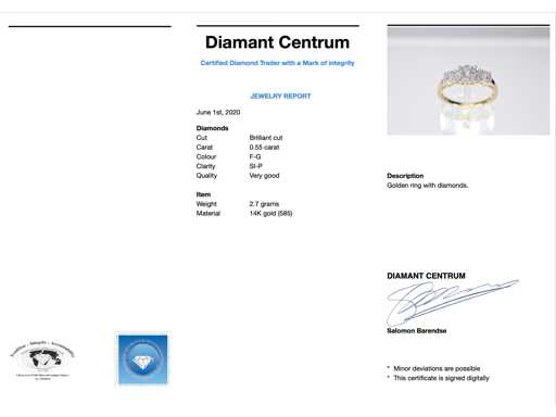Diamant: Natuurlijk; Slijpvorm: Briljant en rond geslepen; Gewicht (carat): 0.55 carat; Kleur: F-G; Zuiverheid: SI-P; Slijpkwaliteit: Zeer mooi; Juweel: Ring; Gewicht: 2.7 gram; Ringmaat (op maat gemaakt*): 54 (17.25 mm); Materiaal: 14k goud (585); Conditie: Nieuw; Verpakking: Luxe sieradendoos; Toelichting: De kwaliteit is overgenomen van het rapport behorend bij item. De waardebepaling is een beoordeling van een gecertificeerde diamantair, gebaseerd op consumentenprijzen.; Consumentenprijs: € 2.538,-