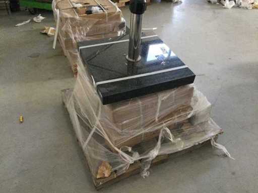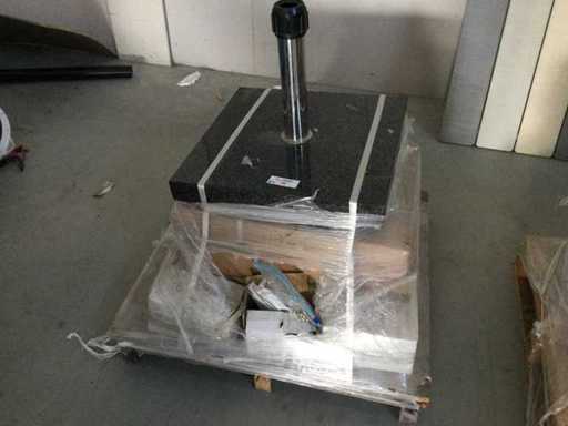 Partij bestaande uit vier granieten parasolvoeten met RVS buishouder. De zware natuurstenen voet zorgt voor een stabiele plaatsing van parasols op terras of in de tuin.