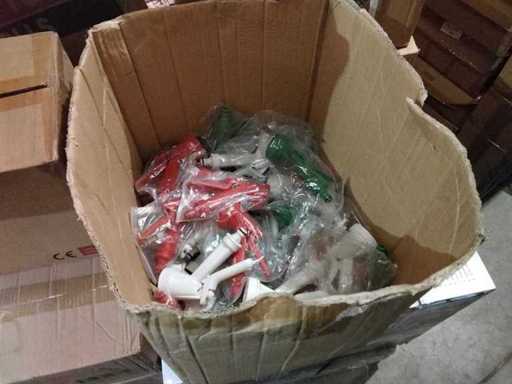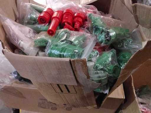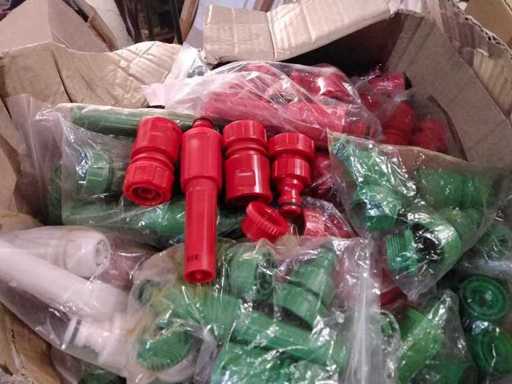 Grote volle doos met spuitkoppen en tuinslangkoppelingen