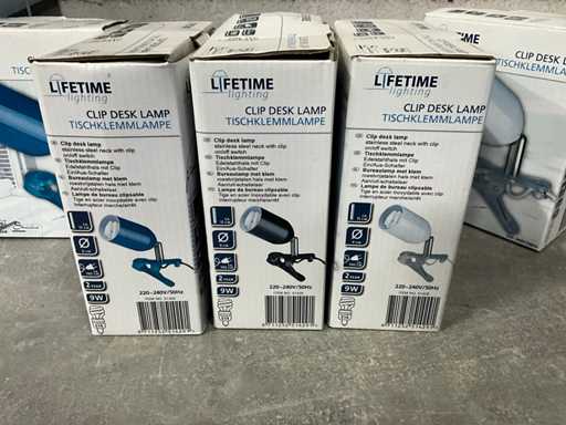Kavel bestaande uit; 6x tafellamp grundig, 5x bureaulamp met klem. Diverse kleuren.