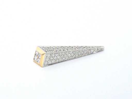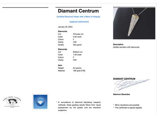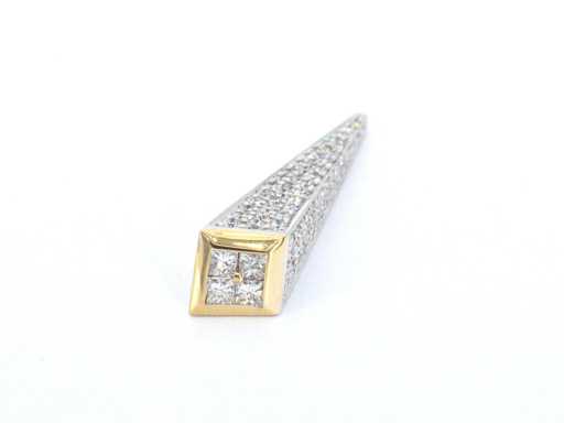 Diamant: Natuurlijk; Aantal: 4 stuks; Slijpvorm: Prinses geslepen; Gewicht (carat): 0.32 carat; Kleur: F; Zuiverheid: VVS; Slijpkwaliteit: Zeer mooi; Diamant (secundair): Diamanten; Aantal diamanten: 79 stuks; Slijpvorm: Briljant geslepen; Gewicht (carat): 1.00 carat; Kleur: F; Zuiverheid: VVS; Juweel: Hanger (excl. ketting); Gewicht: 6.5 gram; Materiaal: 18k goud (750); Conditie: Nieuw; Verpakking: Luxe sieradendoos; Toelichting: De kwaliteit is overgenomen van het rapport behorend bij item.