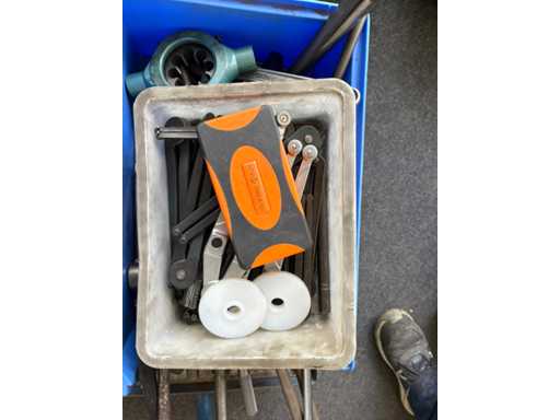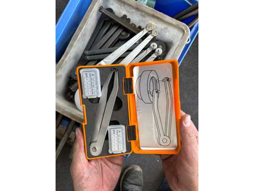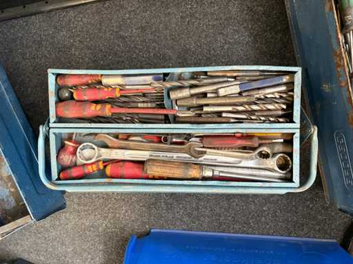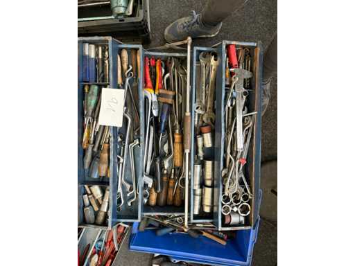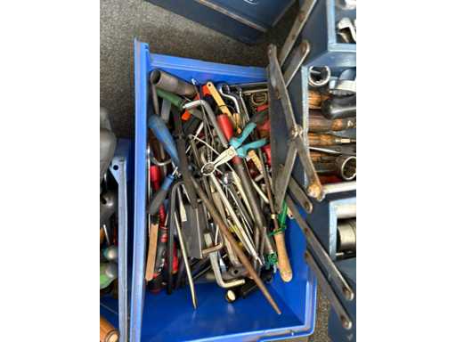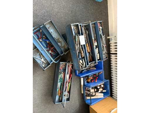 • Diverse metalen kisten (gevuld, klassiek opvouwbaar, deels van Hazet/Gedore/Stahlwille)