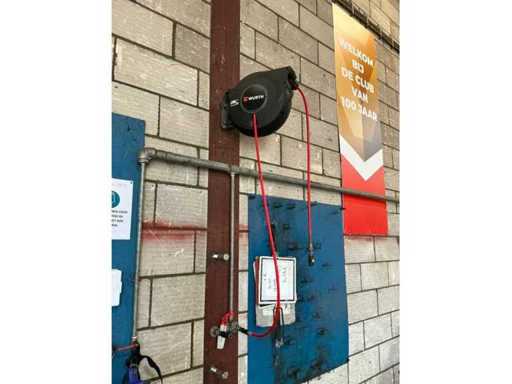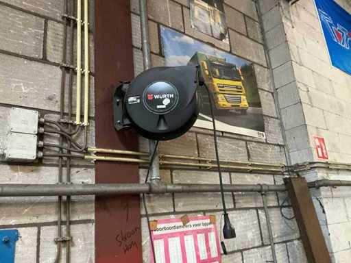 Bestaande uit 1x Wurth stroomhaspel, 1x Wurth persluchtslanghaspel, 1x Hazet persluchtslanghaspel en 1x Zeca stroomhaspel, allen op circa 260cm hoogte wandgemonteerd