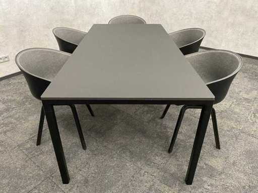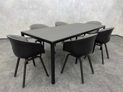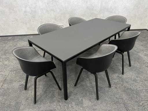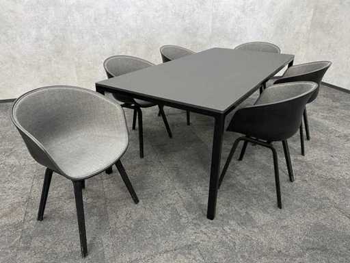 kavel bestaande uit 1x HAY T12 nieuwe design tafel. en 6x HAY AAC22 design stoel v.v. zwart houten frame, kunststof kuipzitting met gestoffeerde binnenzijde.
