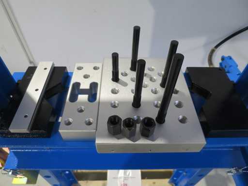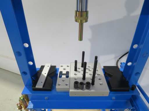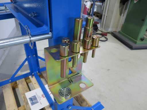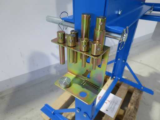 Frame press, CE-gecertificeerd volgens de nieuwste richtlijnen. - Met handmatige hydrauliek - Cilinder zijwaarts bewegen - 2 pcs persblok 200x250x40mm / 200x70x40mm, maximaal 30t met M16 schroefgaten en enkele M16 schroefbouten - 8 stuks persbouten, 10 - 30 mm, met snelwisseladapter, maximaal 20 ton - 2 Drukpads Druk 20 t Slag 180 mm Vrije breedte tussen palen 540 x 100 mm Installatiehoogte maximaal 990 mm Cilinderdiameter 72 mm Zuigerdiameter 48 mm Machinegewicht ca. 0,12 t Ruimtebehoefte ca. 0,8 x 0,7 x 1,8 m Conditie: nooit gebruikt / nieuw (5)