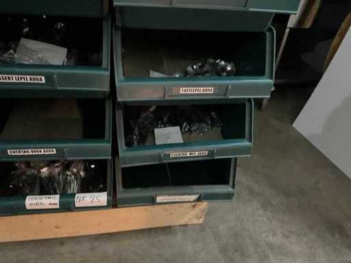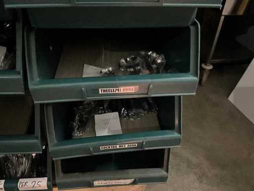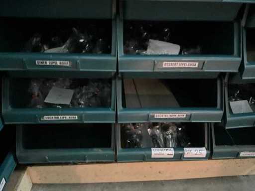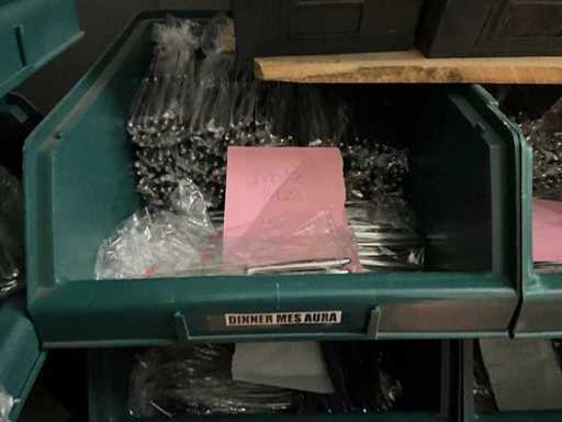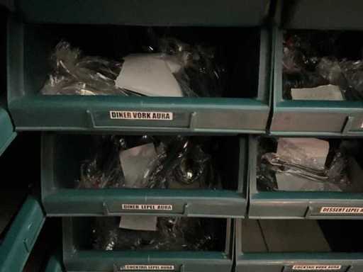 Bestaande uit 460x diner mes, 410 diner vork, 180x diner lepel, 510 dessertmes, 390x dessert vork, 550x thee lepel, 360 x cocktaillepel in 15 kunststof bakken.