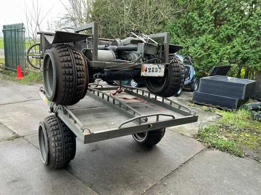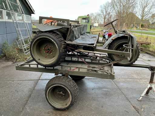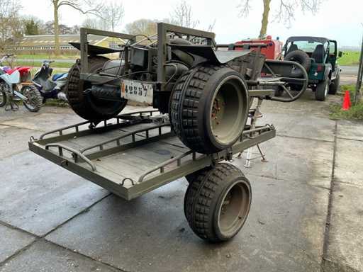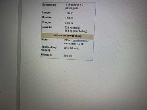 Inschuifbaar, kan aan parachute gedropt worden, voorzien van 2 cilinder luchtgekoelde 2-takt FN motor, Metzeler Lypsoid 22x12 luchtbanden, afmeting toaal zoals getoond circa 2800x1700x1700mm.