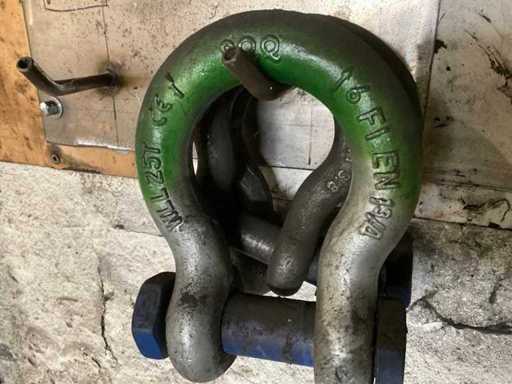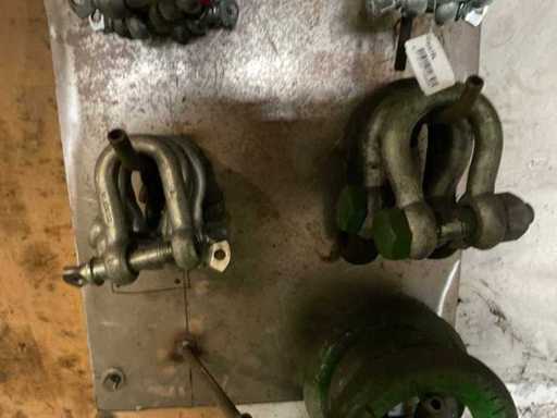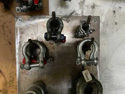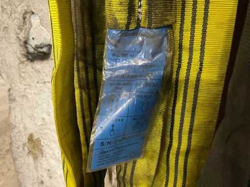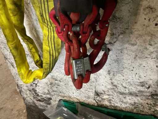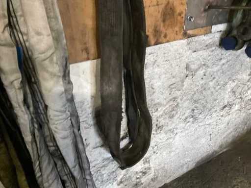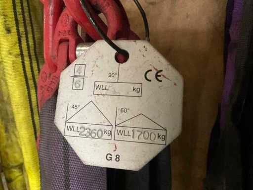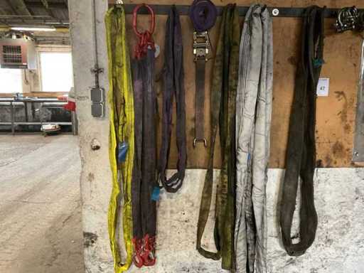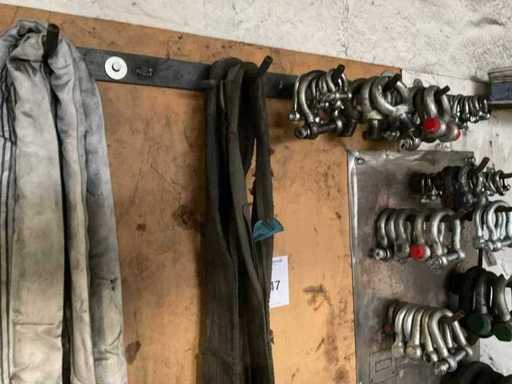 Diverse hijsmiddelen aan muur w.o. Hijsbanden, 4-sprong, hijsogen, spanbanden.
