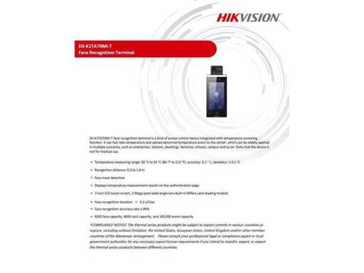 De DS-K1TA70MI-T gezichtsherkenningsterminal is een soort toegangscontroleapparaat dat geïntegreerd is met de temperatuurregelfunctie.